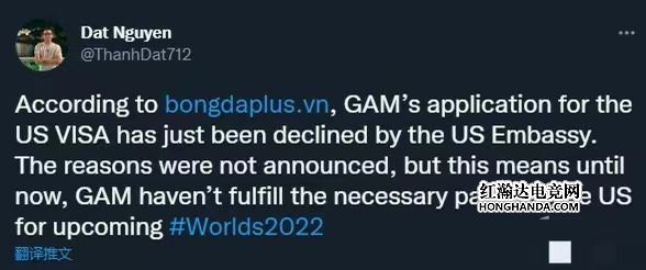 据越媒在推特上爆料,越南赛区GAM战队申请签证遭拒,原因不明。GAM可以在两周后也就是9月24日再去申请签证,但这也意味着GAM需要到9月24日才能确定能否参加S12的比赛。该记者表示,除GAM外,越南赛区二号种子SGB也没拿到签证,这也意味着越南赛区有可能缺席2022LOL全球总决赛的比赛。此前越南赛区因为疫情原因已经缺席了2020、2021两次LOL全球总决赛的比赛以及2021年MSI的比赛。