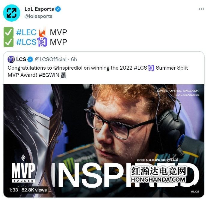 昨日LCS赛区公布了2022LCS夏季赛常规赛MVP的人选,最终由EG战队打野选手Inspired获奖。在2021LEC夏季赛期间,当时效力于RGE的Inspired也获得了常规赛MVP的荣誉。因此,Inspired也成为英雄联盟历史上第一位赢得LEC赛区和LCS赛区MVP的选手。大家可能也很疑惑,毕竟像韩援就很多,但拿到双赛区MVP的,确实一直没能出现。