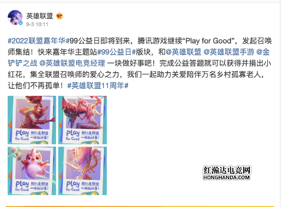“99公益日”是由腾讯公益联合数百家公益组织、知名企业、明星名人、创意传播机构共同发起的一年一度全民公益活动。今年,腾讯游戏继续以“Play for Good”为主题,集结旗下包括《英雄联盟》、《英雄联盟手游》、《金铲铲之战》、《英雄联盟电竞经理》等在内的多款游戏,助力公益梦想!