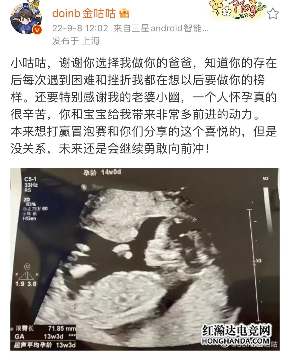 相信现在的大家都开始迫不及待等着世界赛的到来,而没能进入世界赛的选手有的开始了自己的小假期,有的开始备战下个赛季。而作为打了整整一个季后赛BO5的Doinb,更是传来了喜讯,昨日Doinb官宣自己要当爸爸了,他也发文说出了自己的激动。