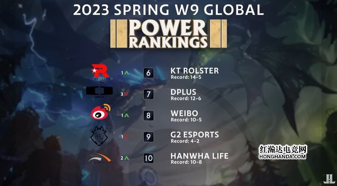 第6-10名中,第六名是KT,排名上升了一位;第七名是DK,排名直接暴跌3位;第八名是WBG,排名上升了一位,也是因为WBG击败了NIP和WE两队,状态逐渐稳定;第九名是G2,排名下滑了一位;第十名是HLE,排名上升了2位。
