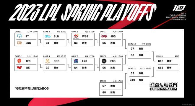 随着WBG以2-1的战绩击败了RA,也宣告着LPL春季赛常规赛全部结束。十支晋级季后赛的战队分别是JDG、EDG、LNG、WBG、BLG、OMG、TES、TT、RNG和WE。其中JDG和EDG是常规赛的前2名,确定了季后赛复活甲的机会。而最终的季后赛赛程也随之公布。