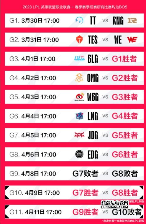 2023LPL春季赛常规赛已经结束,在经历了十周赛事的激烈争夺后,JDG、EDG、LNG、WBG、BLG、OMG、TES、TT、RNG以及WE共十支队伍成功打入了季后赛。而在2023年3月30日这一天,LPL春季赛将开启季后赛新的征程,这十支队伍将向春季赛冠军以及MSI资格发起新的挑战。