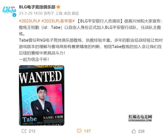 LPL春季赛常规赛已经结束,即将迎来竞争更加激烈的季后赛,而在季后赛正式开始之前,居然还有战队在补强阵容,BLG在29号下午突然官宣,新教练Tabe正式加入了。