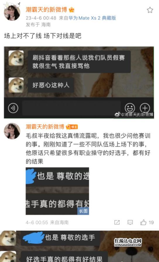 然后是绿毛,绿毛的老婆在微博晒出了和绿毛的聊天记录,在对话中,绿毛表示看到很多人骂BLG的队员买了,自己很生气,直接和那些人对骂。而且绿毛也表示xun是一个有职业操守的选手,希望他可以获得一个好的结果。