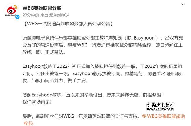 WBG官宣原文如下,表示经过双方友好沟通之后,原WBG主教练Easyhoon解除合约,卸任主教练一职,正式离队。之后回忆了Easyhoon自从2022年加入WBG到现在为止的一些经历,感谢了他的付出,祝福他未来顺利。最后则是感谢了粉丝们对WBG的支持。