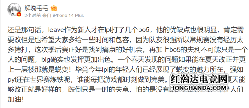 毛毛发文说道:还是那句话,leave作为新人才在lpl打了几个bo5,他的优缺点也很明显,肯定需要改但是也希望大家多给一些时间和包容,因为队友很强所以常规赛没有经历太多拷打,这次季后赛正好是找到痛点的好机会。再加上bo5的失利不可能只是一个人的问题,blg确实也发挥更加出色。一个春天发现的问题如果能在夏天改正并更上一层楼那就是蜕变!毕竟今年lpl的年轻人们已经展现了蜕变的魅力所在,强如pyl还在世界赛炼铁呢,谁能每把游戏都时刻做到完美。所以季后赛的失误夏天能够改正就是好样的,跌倒只是一时的失意,怕的是没有站起来的勇气!年轻人们加油!