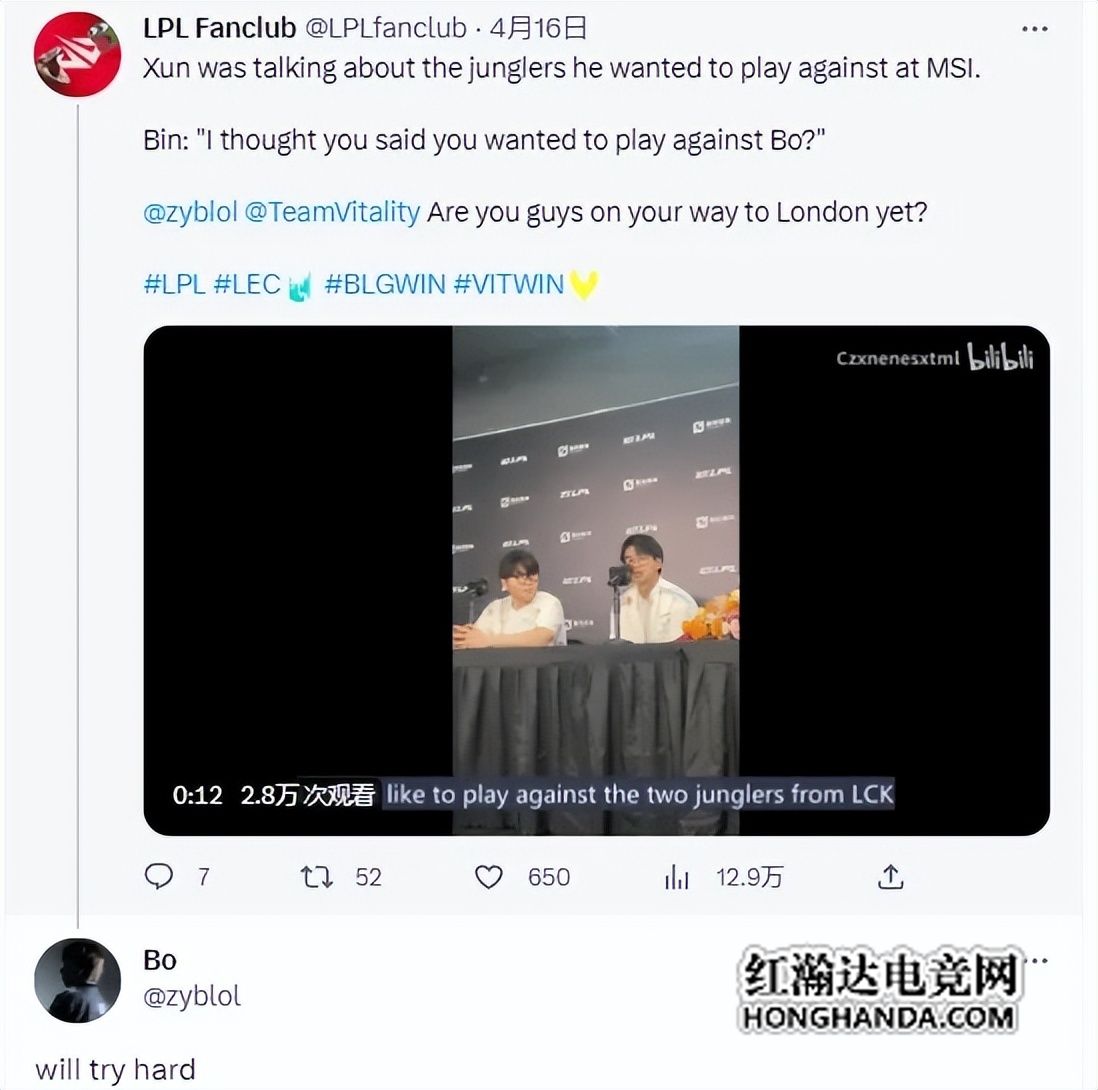 Bin说Xun想在MSI上和Bo交手,Bo回应:会努力去伦敦
