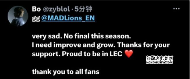 赛后Bo也第一时间发文道歉,表示很难过没能晋级决赛,我还需要提高和成长,谢谢大家的支持,加入LEC很让我自豪,谢谢所有的粉丝们。