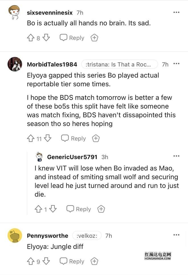 比赛结束后,很多海外网友也纷纷吐槽Bo的表现,有人表示bo是有操作没脑子,也有人表示这场BO5的每场比赛都有打野差距,而且每次Bo选出大树的时候,VIT都会输,因为他不是去刷野保持自己的当即领先,而是喜欢跑到对面野区送。还有人直言:打野差距。