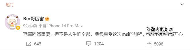 而除了tabe之外,上单bin也在稍后发了微博,他表示:虽然冠军很重要,但这不是人生的全部,自己很享受这届MSI,希望大家都可以开心。