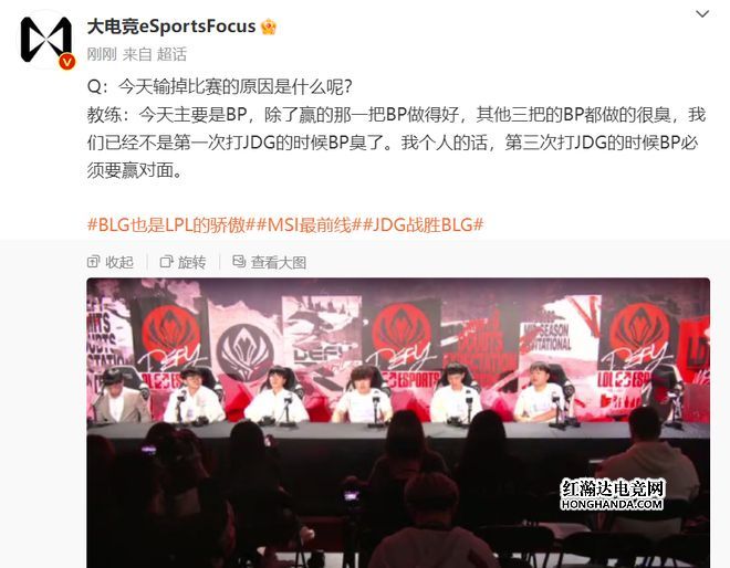 首先是教练Tabe第一个发微博出来道歉,他表示:对不起大家,这场BP太臭了,也没有突破心魔。之后也感谢了在现场为BLG呐喊加油的粉丝们。