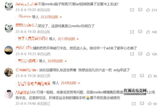 EDG官博下方的评论如下,被骂得最惨的就是辅助meiko,不少粉丝怒斥meiko第四局下路第一波失误,太离谱了,为什么非要冲上去送。也有粉丝直言这场BO5几乎每场都是meiko开局被打半血,然后送人头,换任何AD来玩都玩不了。还有粉丝吐槽但凡meiko少送一点,EDG早进世界赛了。当然也有粉丝承认Uzi打得一般般,但是meiko实在是太离谱了,亚运会如果不是软辅版本,我们怎么办?