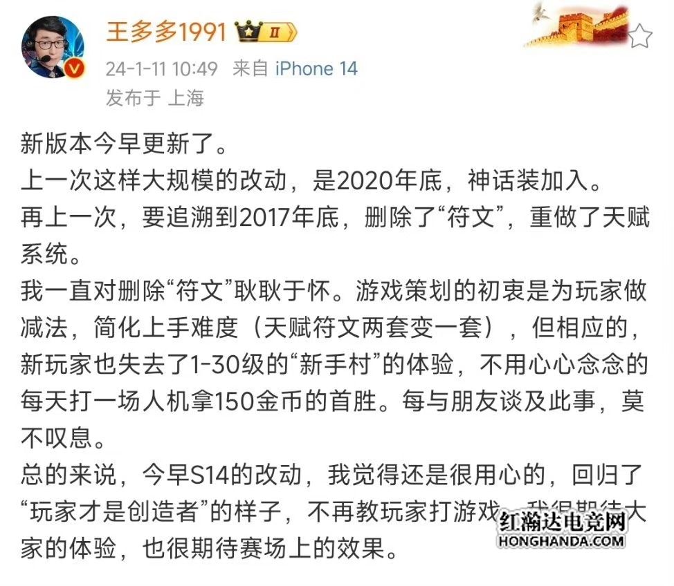 王多多发文表示,继这次新版本的到来,回想上次这样的大改动,应该就是2020年底的神话装备的加入。而再追溯上上次大改动,应该就是删除了符文,新增的全新天赋系统了。对于老玩家王多多而言,也是十分理解英雄联盟官方的初衷,就是尽量把游戏做的简单些,让更多玩家能够体验,而这次新版本,就是回归了“玩家才是创造者”的样子。