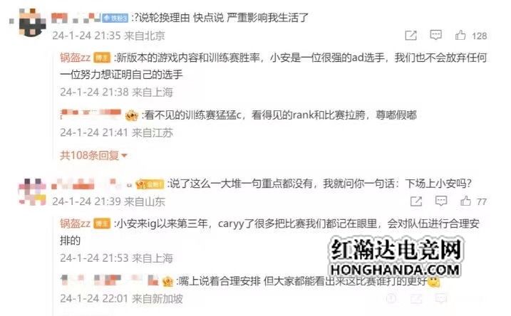 IG对于轮换问题,给粉丝们回应到,因为新版本的游戏内容还有训练赛胜率的原因,所以就没有上小安,小安确实是位很强的选手,俱乐部也不会放弃任何一位努力,想要证明自己的选手,会对队伍选手进行合理的安排。而经理也是表示到,俱乐部都是想让选手们变得更好,大家能提出意见也很感激,会努力让IG变得更好。