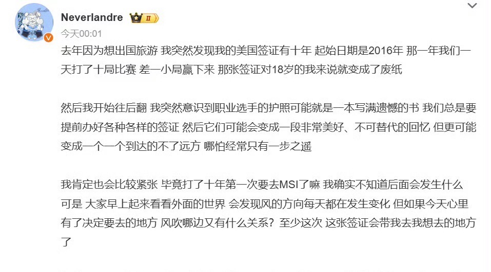 Flandre发文表示到:去年因为想要出国旅游,突然发现自己的美国签证马上要过期了,那一年我们一天打了很多比赛,但差一小局就赢下来了,那张签证对18岁的自己也变成了废纸。后来突然意识到,护照可能就是一本充满遗憾的书,尽全力变成一个到达不了的远方。打了十年比赛第一次要去MSI,确实比较紧张,谢谢一直相信我的人,请大家为AL感到开心吧。