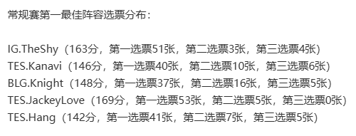 最佳一阵的归属几乎与赛前预测完全吻合:TheShy(上单)、Kanavi(打野)、knight(中单)、JackeyLove(ADC)、Hang(辅助)。其中,TheShy以163分的总评分断层领先,51张第一选票的统治力堪称恐怖。