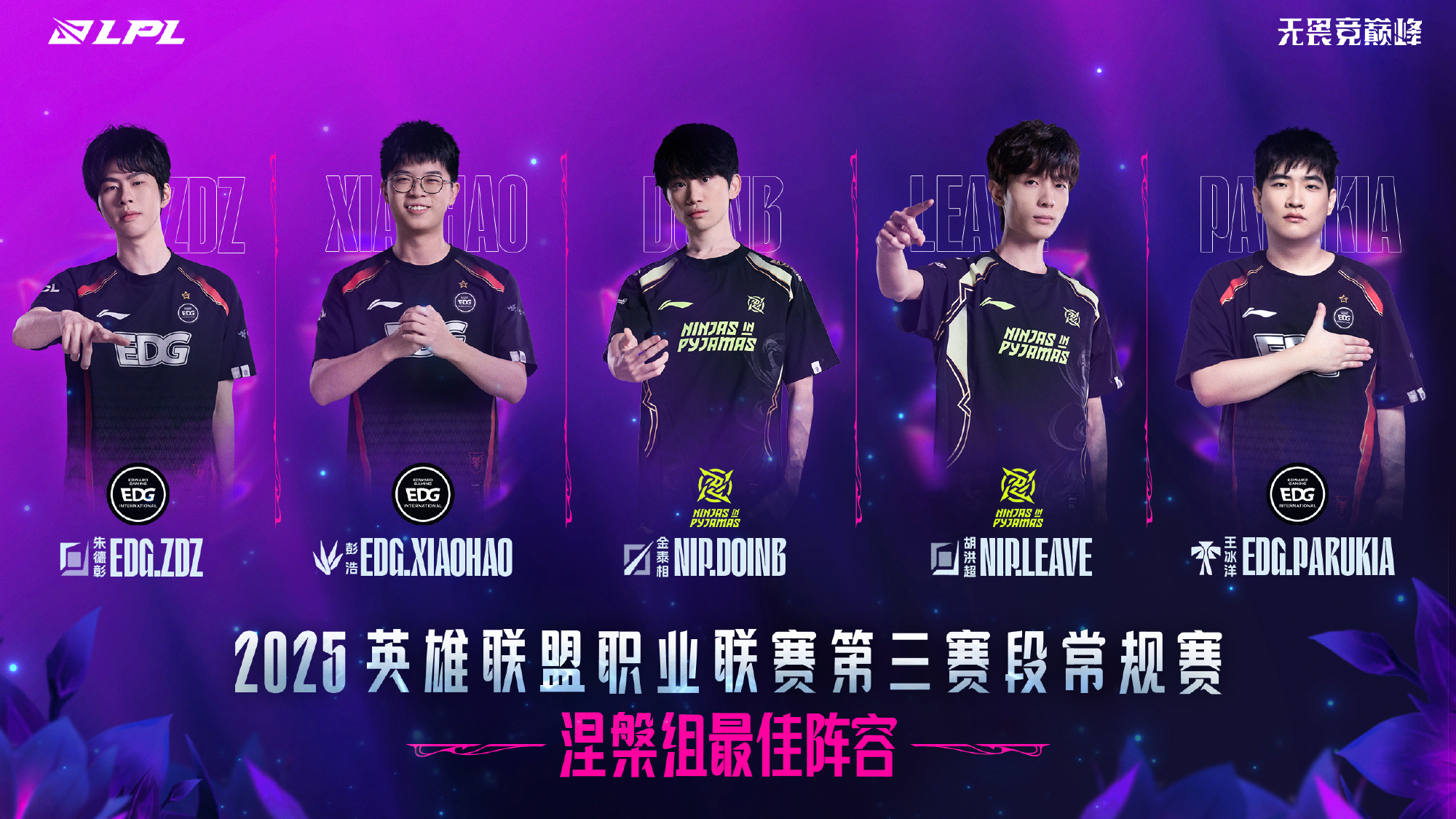 涅槃组的最佳阵容由Zdz、xiaohao、Doinb、Leave、Parukia组成,其中辅助Parukia当选最佳新秀,成为新生代选手中的最大黑马。