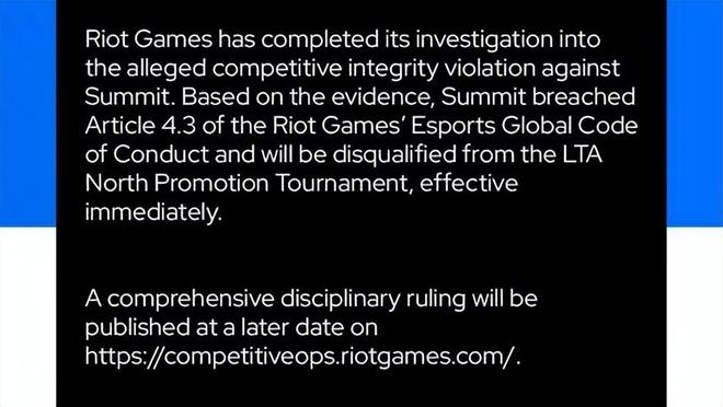 TheShy高中同学Summit,最近在征战LCS赛区升降赛,在交手DSG的比赛里,因为遭到网络攻击,比赛一度暂停超过5个小时,期间Summit选手,打开官方比赛直播间,被观众当场逮捕,官方以作弊为由对其禁赛调查,在调查了一天之后,LCS官方发文宣布:取消Summit的参赛资格。