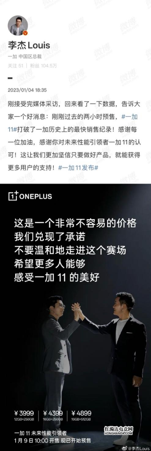 1月4日,一加正式发布新一代旗舰一加 11,并同步开启预售。一加中国区总裁李杰表示:“预售两小时一加11打破了一加历史上的最快销售记录。”