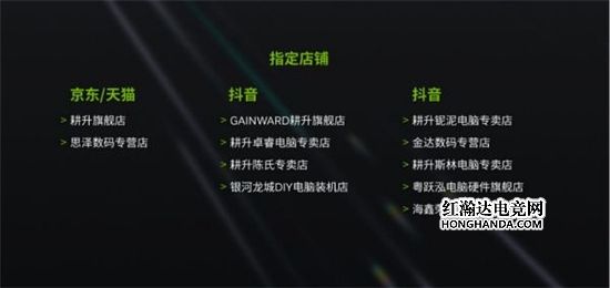 指定抖音店铺:GAINWARD耕升旗舰店、耕升卓睿电脑专卖店、耕升泥电脑专卖店、金达数码专营店、耕升陈氏专卖店、耕升斯林电脑专卖店、银河龙城DIY电脑装机店、粤跃泓电脑硬件旗舰店、海鑫荣电脑经营部