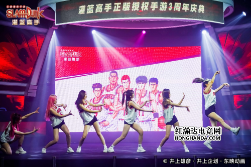 作为本次《灌篮高手正版授权手游》三周年庆的开场,六位美少女带来了一段青春洋溢的舞蹈,伴随着灌篮高手经典曲面《好想大声说爱你》的背景音乐,曾经难忘的各种回忆瞬间浮现在眼前,将活动现场的热情推向了顶点。
