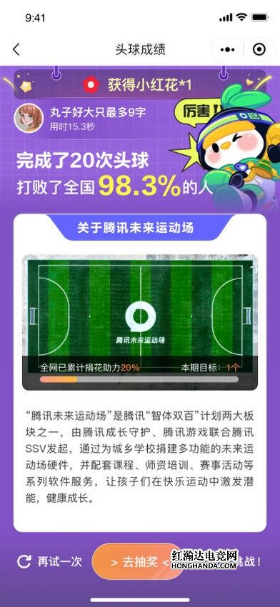 在小程序中,用户将身处高沉浸式AR场景,通过AI识别技术进行线上头球运动。每天线上头球得分满20分,即可向“未来运动场”建设捐赠公益小红花1朵。