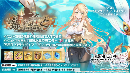 11月24日维护后,限时联动活动「炼金术士与秘密遗迹群岛」将正式开启,活动时间从11月24日开始至12月8日结束,在作战周期内,每一次成功击败BOSS关卡,都可获得「遗迹水晶簇」,积累大量的「遗迹水晶簇」在活动商店可以兑换限定联动舰船「科洛蒂娅·巴兰茨」(超稀有)及活动家具等丰厚奖励。