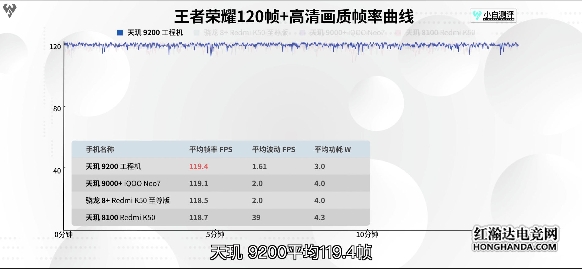 其中在《王者荣耀》60、90及120帧测试中,天玑9200在性能和功耗综合表现全场极佳,尤其在120帧高清画质测试中,天玑9200平均帧率为119.4帧,同时功耗仅为3W。