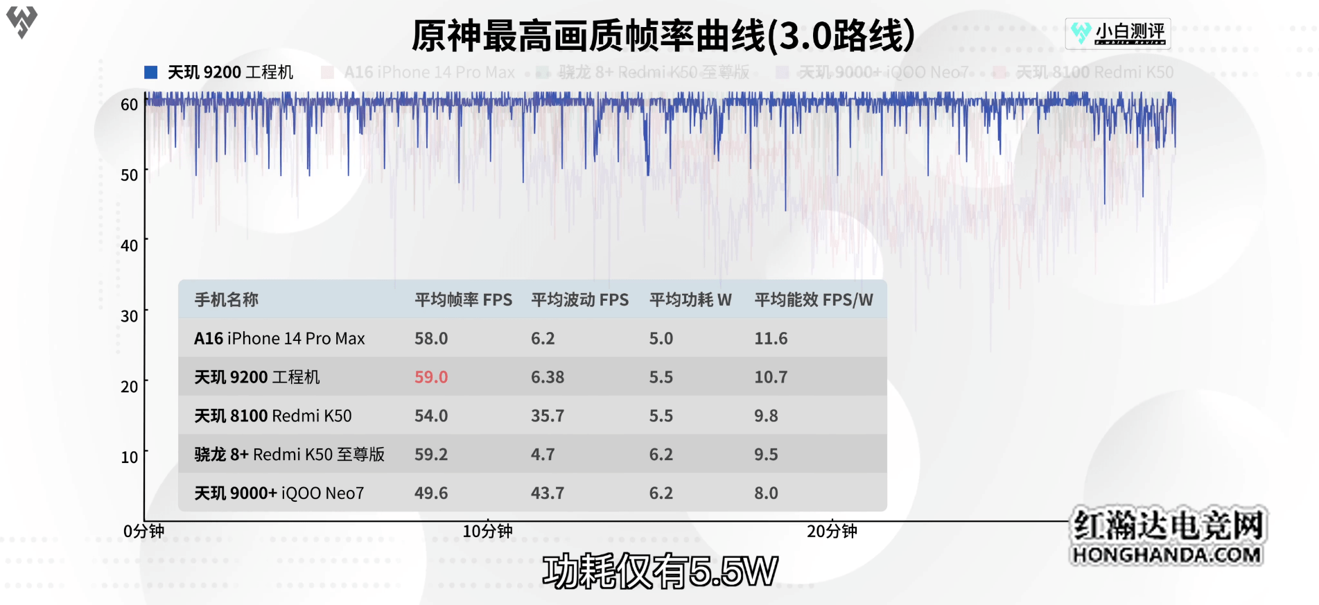 在高负载的《原神》最高画质测试中,天玑9200表现依旧拔尖,在接近满帧的状态下,天玑9200平均功耗仅为5.5W,能效比表现极佳。