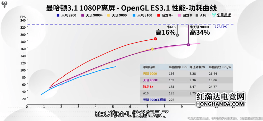 GPU方面,在GFXBench的曼哈顿3.1 OpenGL 1080P和Aztec Ruins Vulkan 1440P两项离屏测试中,天玑9200均展现出了傲人的成绩。其中曼哈顿3.1测试中,天玑9200的11核G715跑出了226fps的高分,性能相较于天玑9000+的169fps提升了34%,且是全场最高,刷新了小白测评数据库手机SoC的GPU性能记录。