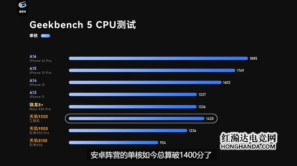 多家专业媒体对天玑9200的工程机进行了详细测试,根据极客湾的实测结果显示,在Geekbench 5跑分中,CPU单核跑分可达1420,多核跑分为4459,且能效方面有比较明显的进步。