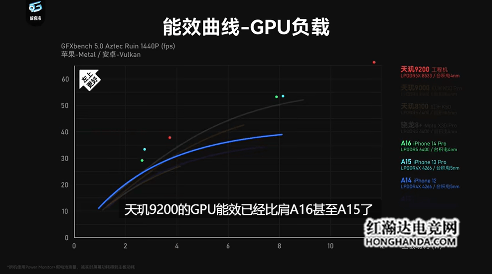 通过GPU能效曲线来看,天玑9200的GPU能效已经比肩苹果A16甚至超越A16了。
