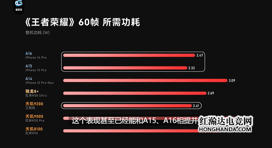 在低负载的《王者荣耀》60帧测试中,天玑9200 功耗仅为2.4W,能效表现相当惊艳。