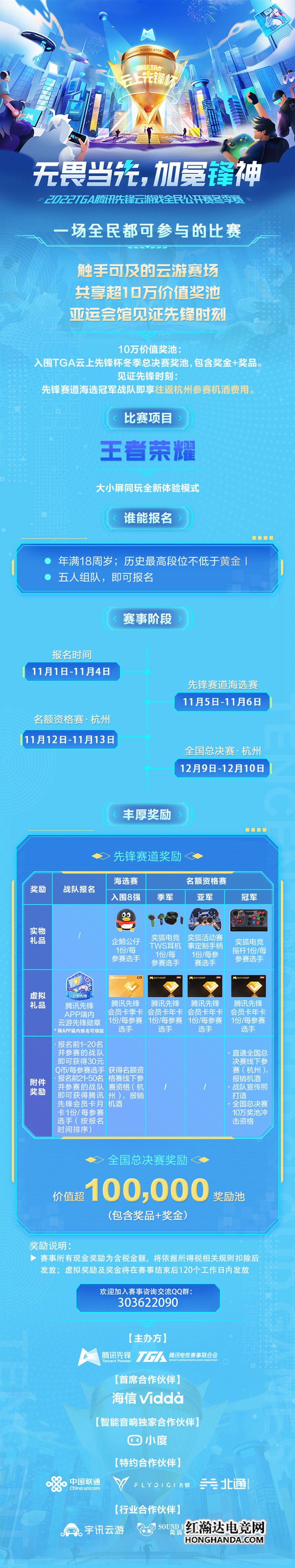 无谓当“先”,加冕“锋”神。TGA云上先锋杯腾讯先锋云游戏全民公开赛“先锋赛道海选赛”将于11月5日-11月6日在线上举行,脱颖而出的8支王者荣耀战队将进入11月12日-11月13日举行的名额资格赛,角逐全国总决赛。最终,TGA云上先锋杯腾讯先锋云游戏全民公开赛总决赛将于12月9日-12月10日在杭州落地。