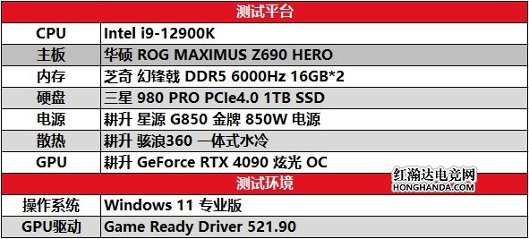 本次测试平台处理器采用Intel酷睿i9-12900K+华硕 ROG MAXIMUS Z690 HERO主板;内存采用 芝奇 幻锋戟 DDR5 6000Hz 16GB*2;耕升 GeForce RTX 4090 炫光 OC 的显卡TDP为450 W,故电源套装采用的是 耕升 星源 G850金牌 850W搭配 耕升 骇浪360 一体式水冷,能最大程度为GPU降温。这套配置足以让耕升 GeForce RTX 4090 炫光 OC能在稳定的环境下最大程度发挥出其超强性能。