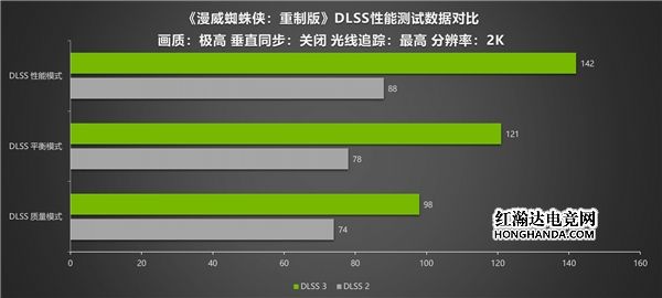 在2K分辨率下,DLSS 3 提升依旧明显,在性能模式下,DLSS 3 有142帧而DLSS 2 有88帧,平衡模式下 DLSS 3 有121帧而DLSS 2 有 78帧,质量模式下DLSS 3 有98帧而DLSS 2 有74帧。帧数最大可提升61%。