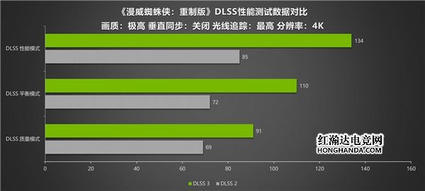 在4K分辨率下,DLSS 2 帧数变化差别不大,而DLSS 3 的提升效果也相差不大。在性能模式下,DLSS 3 有134帧而DLSS 2 有85帧,平衡模式下 DLSS 3 有110帧而DLSS 2 有 72帧,质量模式下DLSS 3 有91帧而DLSS 2 有69帧。帧数最大可提升58%。