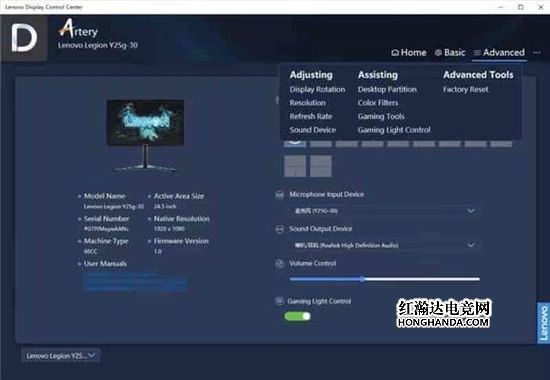 在外观上,拯救者Y25g也非常符合“电竞”属性,整体设计炫酷时尚,自带未来感。RGB焕彩Logo灯色彩多变,为玩家营造更浓厚的电竞氛围,让玩家更好沉浸在充满科技感的竞技氛围当中。不仅如此,联想自带Artery软件驱动(Lenovo Display Control Center),可以更方便控制调节灯光效果,灯效会随着游戏内容,音效,以及键鼠的移动速度自动发生变化。 Artery软件除了能够控制灯光外,还能够帮助玩家更简单快捷的调整显示器设置,无需手动操作OSD按键,并支持快捷键设置,帮助玩家快速切换不同模式,玩家可以根据自己的喜好来进行个性设定。