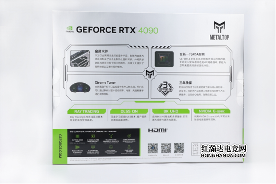 包装盒背面简要描述了影驰 RTX 4090金属大师 OC的部分产品特色,比如全合金上盖和背板、专属魔盘软件、RTX/8K HDR支持等等,玩家能够通过包装盒对这款显卡有着初步的了解。