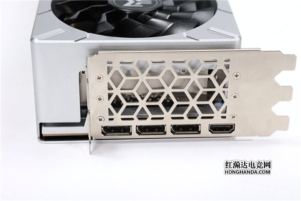 输出接口:显卡侧面装有镂空金属挡板,便于安装和协助散热,搭配金属支撑杆可稳固支撑显卡重量,同时对显卡输出接口进行金属加固。