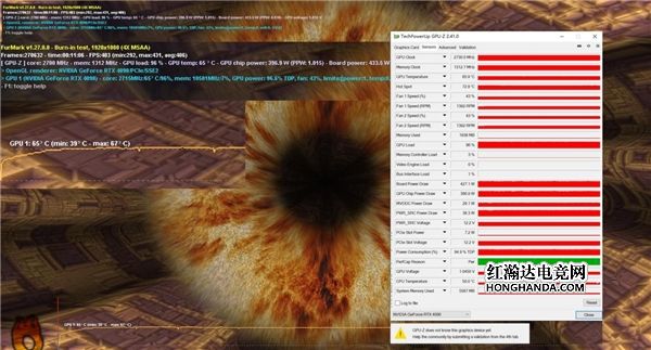 显卡占用率拉满的情况下,Furmark拷机超过十分钟,显卡频率稳定在2700MHz以上,温度稳定在67℃,显卡整体功耗在430W左右。