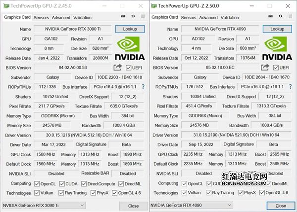 (左侧为影驰 RTX 3090Ti 星曜 OC ,右侧为影驰 RTX 4090 金属大师 OC)