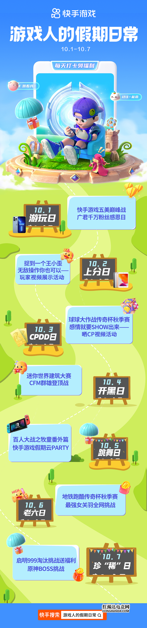 心心念念的十一长假将至,游戏人用什么方式愉悦自己?假期计划不好搞,快手游戏来支招——为了带给大家更美好的假期生活,快手游戏推出“游戏人的假期日常”活动,向全网游戏玩家吹响快乐集结号。即日起至10月7日,多个不同主题日将花式送福利、快乐玩直播,相信热爱游戏的你会玩得不亦乐乎!