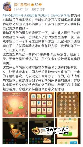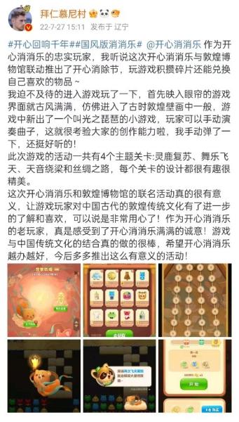 同时,通过对社交媒体上用户发布内容的观察,我们也发现对于此次开心消除节与敦煌博物馆的合作,用户也给予了积极正向的反馈。这无疑是对本次《开心消消乐》开心消除节取得圆满成功的一个有力佐证。