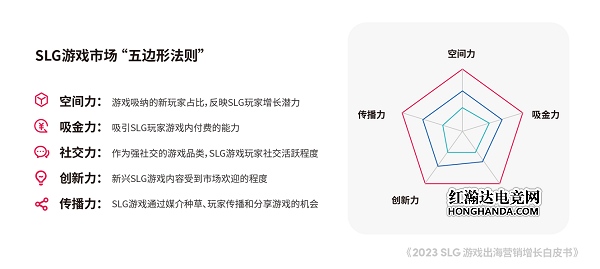 为助力 SLG 游戏出海厂商选择适合自身的目标市场,白皮书开创性地推出了“五边形法则”,全面度量不同市场的潜力。基于“空间力、吸金力、社交力、创新力、传播力”五个维度的剖析,SLG 游戏出海厂商可以对目标市场进行精确扫描,通过“知己知彼”确立更具实战意义的市场策略。