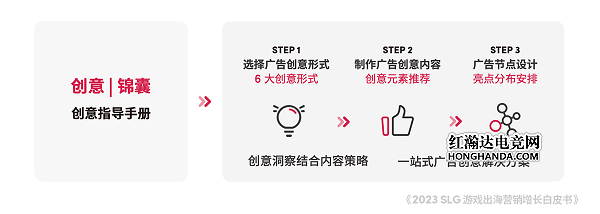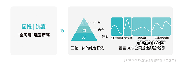 至于回报层面,SLG 游戏出海主要的压力来自于营销推广的 ROAS (广告支出回报)长效提升困难。为此,白皮书提出针对 SLG 游戏的“全周期”经营策略,为游戏厂商指明“广告投放+内容营销+阵地经营”三位一体的行动方向。SLG 游戏可根据注册期、大推期、平推期、节点营销期不同阶段的特点,设置差异化的广告策略,通过品效协同进一步实现人群破圈和降本增效。