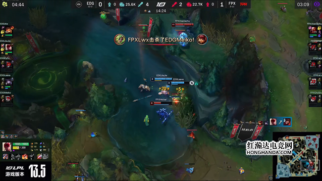 FPX开局就抱团在上半区集结,机器人精准勾中阿卡丽以后将其击杀拿到一血。随后机器人在对线期给EDG双人组施加了巨大压力,厄斐琉斯被勾出闪现再勾中击杀,不过人头并没有落到霞身上。小炮在中路跳脸换血以后被猴子找到机会Gank抓死。没有闪现的厄斐琉斯面对机器人的压力根本无法正常发育,频频被找到机会带走,加上大树趁热打铁的不断针对,厄斐琉斯短短六分钟阵亡三次,前期节奏已经彻底崩盘,霞斩获双杀彻底打开了局面。FPX前期以机器人为节奏核心发动凶猛进攻,EDG只能被动招架节节败退,陷入了劣势局面。机器人手感愈发火热,不断精准神钩为队伍持续扩大领先。