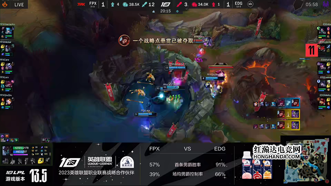 大龙刷新以后FPX在河道摆开阵势迎接EDG前来接团,霞的输出实在太过爆炸,EDG一触即溃阵亡野辅,FPX众志成城一波推进结束了比赛,恭喜FPX以下克上2-1终结了EDG的七连胜!