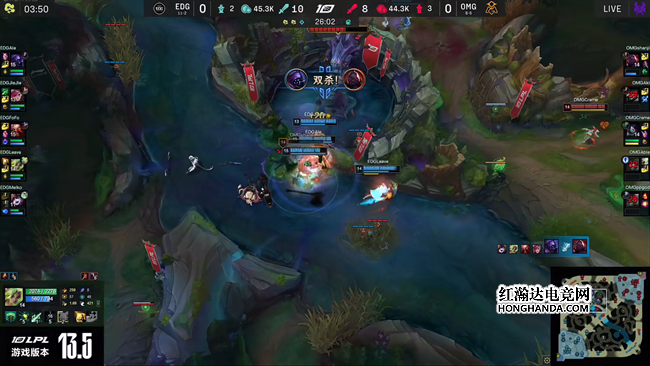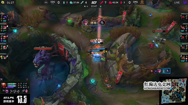 EDG开始在上半区布控视野,大树靠近河道遭遇安妮闪现开团瞬间被秒,EDG立刻动手开打大龙,OMG众人前来阻止但没有任何机会,EDG稳稳拿下大龙Buff并且开团斩杀鳄鱼,随后推掉中路二塔。回城休整过后EDG强势推进高地,凭借之前积累的装备优势轻松开团击溃OMG,一鼓作气在25分钟就推平基地结束了比赛,恭喜EDG 2-1战胜OMG,继续领跑LPL积分榜。